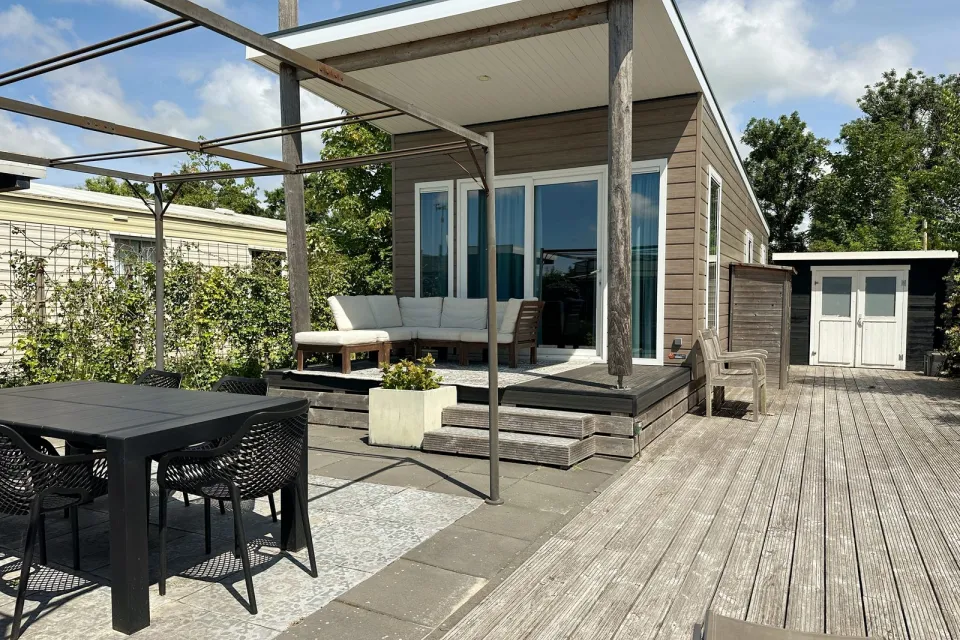 Stap naar buiten en ontdek de luxe van uw eigen tuin. Op het ruime houten terras vindt u een overdekte loungehoek, perfect voor een drankje in de avond. Er zijn comfortabele ligbedden om te ontspannen in de zon. De buitenkeuken met houtskool BBQ nodigt uit tot gezellige avonden buiten. De tuin heeft zowel een plek in de ochtend- als avondzon, zodat u de hele dag van de zon kunt genieten. Dit chalet is ook vrijstaand en is een oase van rust en privacy.