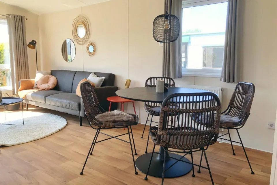 Dit chalet voelt direct huiselijk aan. In de woonkamer vind je een comfortabele zithoek en een eettafel voor vier personen. Grote ramen brengen veel licht naar binnen en geven uitzicht op de tuin.